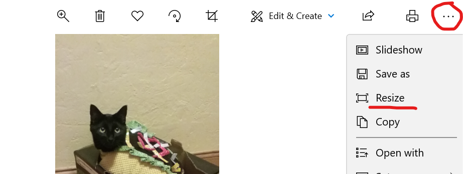 If your boss sends you a 5000×2000 pixel, 600 dpi photo with file size of 15mb to post on your website, you’ll inevitably need to shrink that thing down to a more optimal file size. In Photos, you will need to dig a little bit to find the resize tool. It is buried in the utility menu in the top right corner identified by the ellipses symbol, which looks like “…” and may be referred to as “those three dots.” From there you can select Resize.
